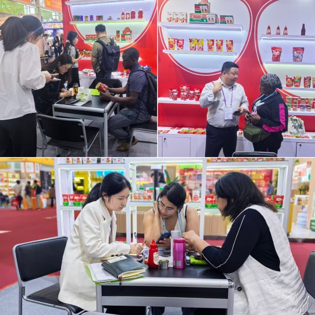 在食品展区,本次以番茄沙司系列为核心,不仅推出青椒洋葱味、蘑菇味等多款差异化创新口味,更搭配PET瓶装、带嘴立袋两种新型包装,融合独特的南美风味,凭借高颜值与优口感赢得全球采购商青睐,市场反馈热烈。截至目前,已与非洲、中东、东南亚及“一带一路”沿线核心市场的采购商,初步达成十个货柜的番茄沙司采购意向,覆盖多区域主流消费需求。