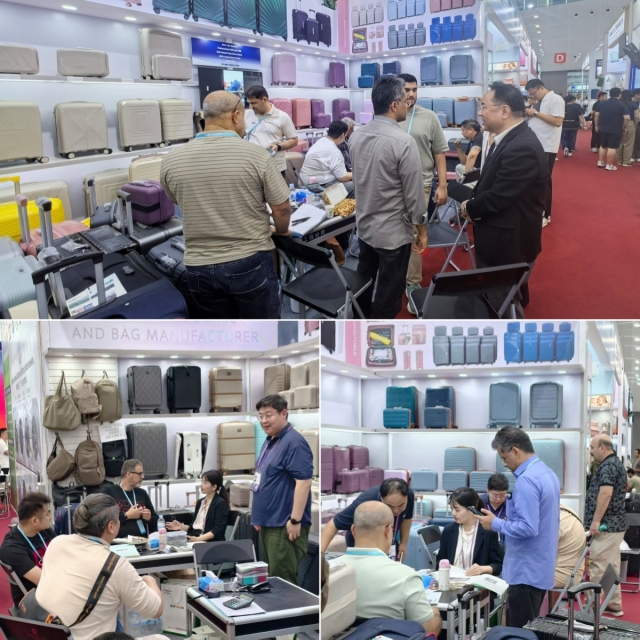 在箱包展区,为精准匹配全球不同市场消费需求,箱包团队精心筹备70余款样品,涵盖新款外观PP箱、铝框前开PC箱、大容量软包等多材质、全尺寸产品,更推出双面前开PP箱、可压缩双肩背包等潮流新品,全面覆盖出行、收纳等多元场景。多款样品凭借“轻便抗摔、易于定制、辨识度高”的核心优势,成为采购商关注焦点。开展首日,箱包展区便迎来“开门红”,不仅斩获欧洲、中东、南美等多区域客户的现场签单,同时与数十位全球采购商达成明确采购意向,展现出全球市场对安粮箱包产品的高度认可。
